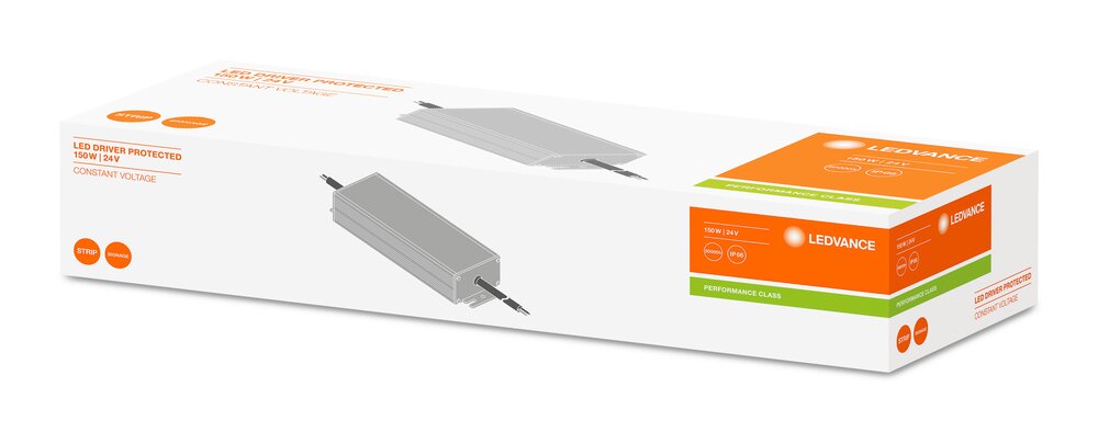 Constant voltage LED driver for outdoor use. Product features: Available in 30 W, 60 W, 100 W, 150 W and 250 W. Lifetime: up to 50,000 h (at max. tc temperature). Degree of protection: IP66. Operating temperature range at TA: -40... 50 °C. Supply voltage: 220... 240 V. Operating frequency: 50/60 Hz. Surge protection: up to 4 kV (L-N) for 30W/60W, 6 kV (L-N) / 6 kV (L/N-PE) for 100W/150W/250W. Short circuit and overload protection. Product advantages: Optimized for operation with 24 V flexible LED light strip. 5-year warranty. Very stable output power. Quick and easy installation thanks to pre-wiring. High efficiency and reliability. Installation in very cold and hot environments. Areas of application: Suitable for indoor and outdoor installations. Façade and building lighting. Particularly suitable for lighting public spaces. Bathrooms, kitchens and outdoor areas. Offices, shopping malls, hospitals, restaurants, hotels.
