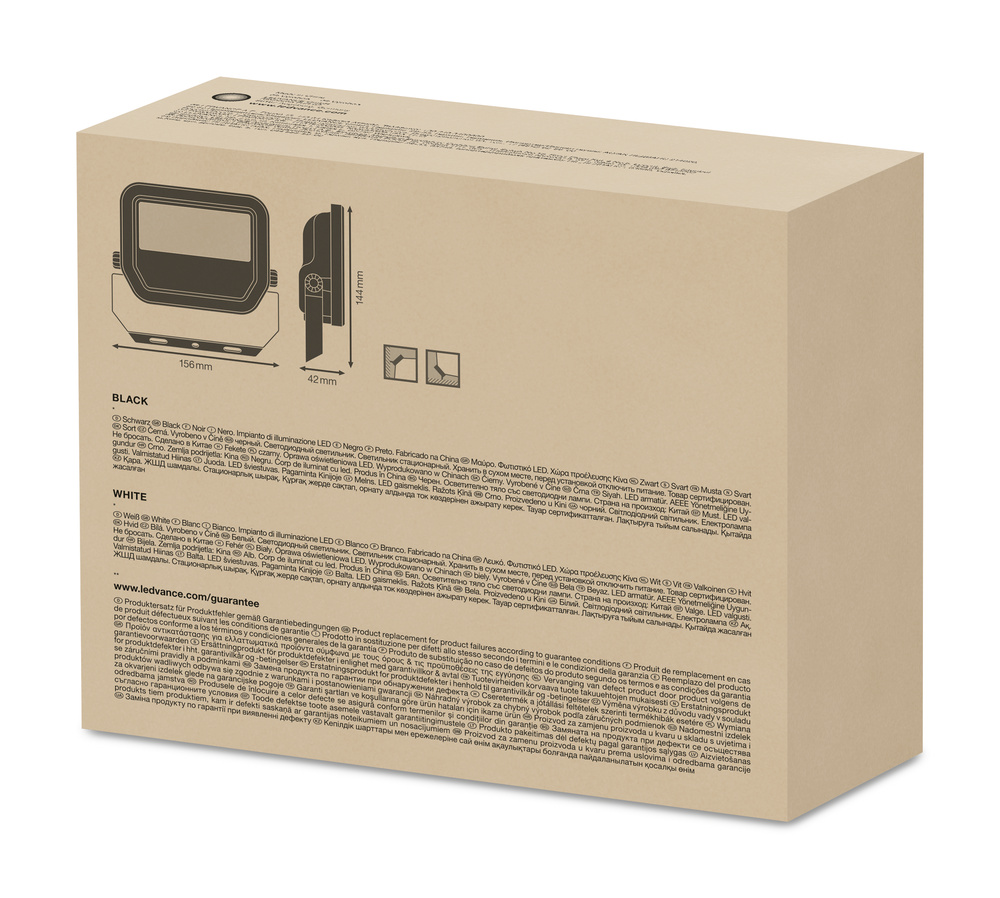 Versatile floodlights with up to 2400 lm luminous flux. Product features: Reflector-based, symmetrical light distribution with 100° x 100° beam angle. Integrated ballast with wide input voltage range, suitable for 100 - 277 VAC. Surge protection: up to 4 kV (L/N-PE), 2 kV (L-N). Mounting bracket with 30° angle and large rotation range. Pre-installed, flexible cable (H05RN-F) with 1 m length, 3 x 1.0 mm² crimped. Product advantages: Bright, robust and durable. Safe and very uniform illumination, thanks to opal, tempered glass diffuser. No light emission in the upper half-space (ULOR 0%) at 0° inclination. Energy savings of up to 90% compared to halogen lamp floods. 5-year warranty. Areas of application: Replacement for floodlights with halogen lamps. Outdoor application (IP65). Public space. Illumination of facades. Sites. gardens, balconies and other outdoor areas.