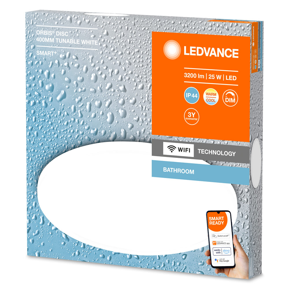 Smart bathroom decorative ceiling and wall with Wi-Fi technology IP44 TW and dimmable. Product features: Degree of protection: IP44. Controllable via LEDVANCE SMART+ WiFi app (with at least Android™️ 4.4 or iOS 10.0). Control via Google Assistant or Amazon Alexa possible. Colour temperature adjustable via Tunable White: 3,000... 6,500 K. Dimmable. Network protocol: WiFi. Product advantages: Easy and quick installation. Areas of application: Bathroom. Technical equipment: Carrying bracket included. Including mounting screws and dowels. Control via app or voice control requires compatible smart home system. A smartphone or tablet is required for control via LEDVANCE SMART + WiFi app.