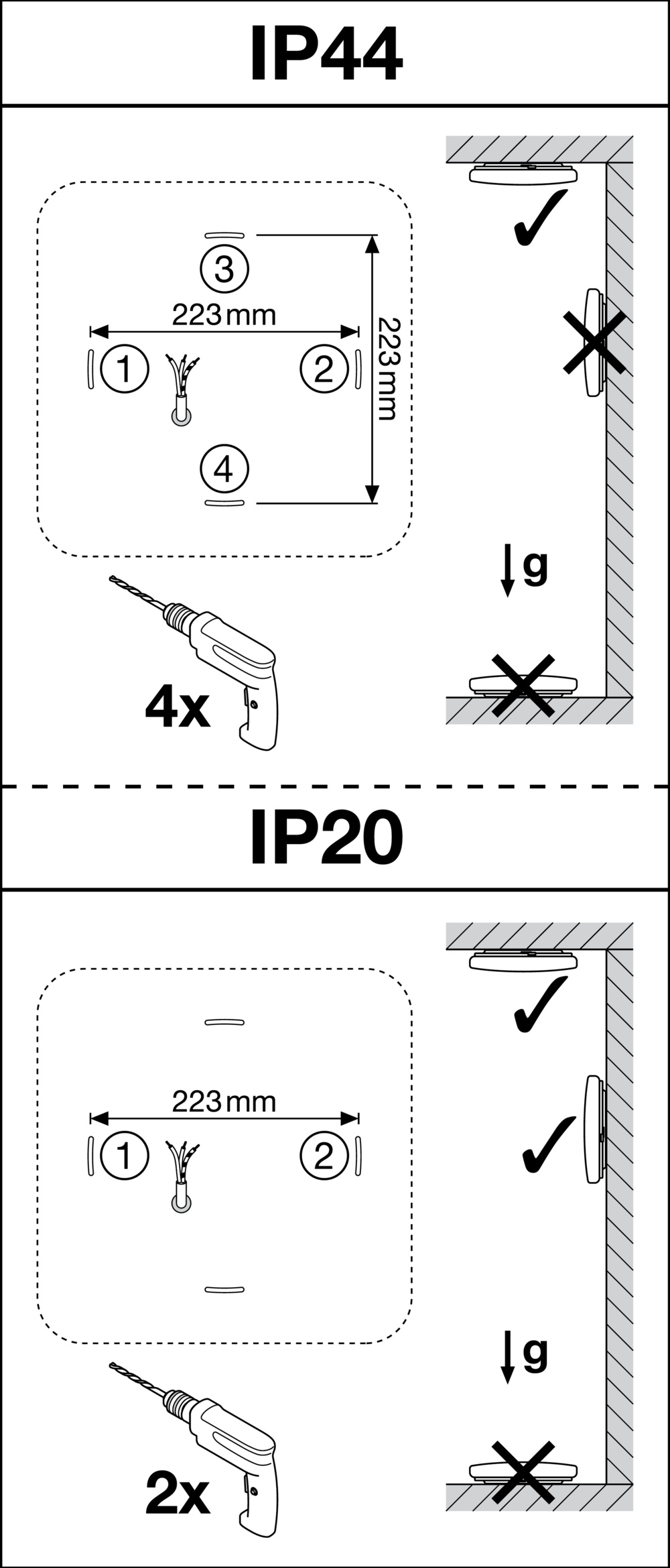 Wall and ceiling light with IP44. Product features: Degree of protection: IP44 (ceiling mounting), IP 20 (wall mounting). Impact resistance: IK03. Metal housing, PMMA cover. Operating ambient temperature range: -20 - +40 °C. Indoor use only, not suitable for outdoor use. Product advantages: Indoor luminaire with high luminous efficiency. Up to 55% energy savings compared to luminaires using compact fluorescent lamps. Easy and quick installation. Very homogeneous light. 3-year warranty. Areas of application: corridors. Staircases. Bathroom. Gains. Technical equipment: Replacement cover available as an option.