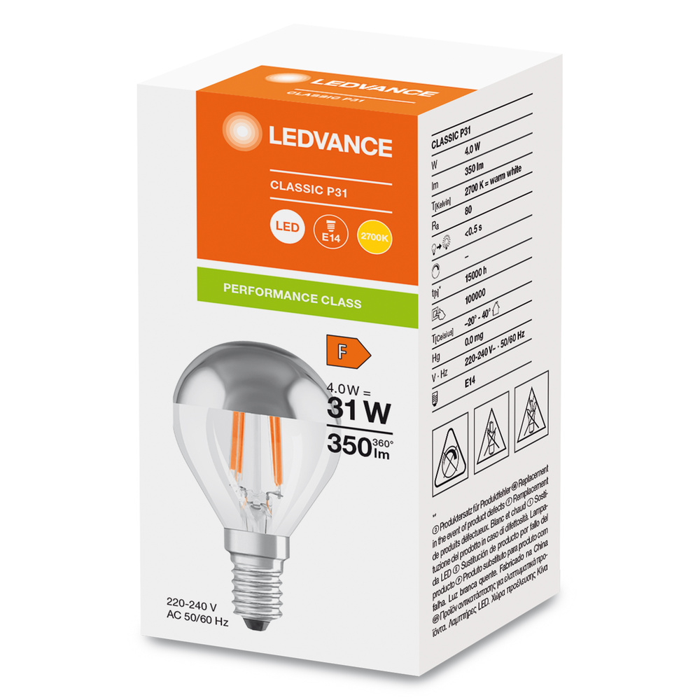 LED lamps, classic mini ball shape, with mirror piston crown. Product features: Mirror coating of the piston tip: gold or silver. Beam angle: up to 300°. Lamp made of glass. Good light quality; Color rendering index Ra: ≥ 80; constant color location. Product advantages: Long service life of up to 15,000 h. Low energy consumption. Easy lamp replacement thanks to compact design. Instant 100% light, no warm-up time. Lamps with innovative LED "filament" technology. Areas of application: Ideal for decorative fixtures. Mirror lighting. Household applications. General lighting. Outdoor use only in suitable outdoor luminaires.