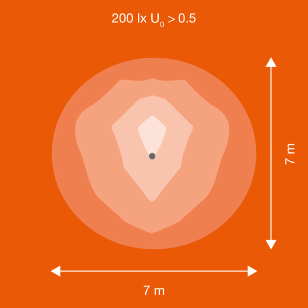 Focos con distribución de luz rotacional simétrica para grandes alturas de mástiles. Características del producto: Alta eficiencia luminosa: hasta 140 lm/W. Distribución de luz rotacional simétrica para altas alturas de instalación. Soporte de montaje biselado (45°) con rango de rotación de hasta 180°. Grado de protección: IP66. Resistencia al impacto: IK08. Rango de temperatura ambiente durante la operación: -30...+50 °C. Alta protección contra sobretensiones de hasta 10 kV (L/N-PE), 6 KV (L-N). Membrana climática integrada para evitar la formación de condensación dentro de la luminaria. Conexión por cable (2 m), se requiere cableado. Ventajas del producto: ahorro energético de hasta un 90% en comparación con las lámparas halógenas. Hasta un 45% de ahorro energético en comparación con las luminarias que utilizan lámparas de descarga convencionales. Brillante, robusto y duradero. Distribución uniforme de luminancia y reducción del deslumbramiento. No hay emisión de luz en el semiespacio superior (ULOR 0%) a inclinación 0°. Ojo de cerradura para una instalación extra sencilla. Garantía de 5 años. Aplicaciones: Sustitución directa de luminarias que utilizan lámparas HID. Uso exterior (IP66). Plaza. Espacio público. Industria. Instalación deportiva. Iluminación de grandes áreas. Marco D según la EN 60598-2-24 para locales comerciales en riesgo de incendio, por ejemplo, debido a acumulación de polvo.