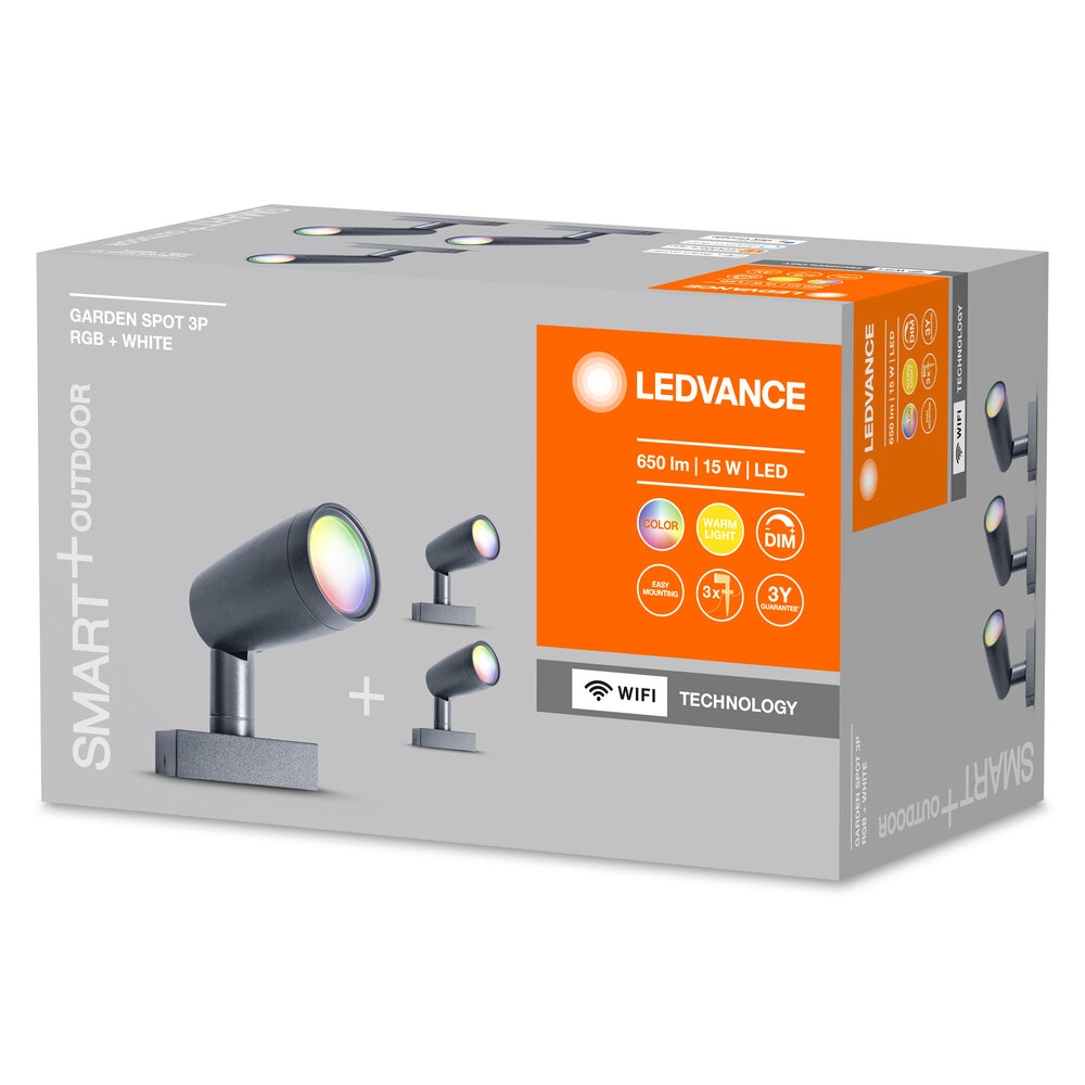 Focos decorativos para aplicaciones exteriores con tecnología WiFi. Características del producto: Controlable mediante la aplicación WiFi LEDVANCE SMART+ (al menos con Android™️ 4.4 o iOS 10.0). Control posible mediante Google Assistant o Amazon Alexa. Control de color RGB, aproximadamente 16 millones de posibilidades de color pueden ajustarse. Regulable. Temperatura de color: 3.000 K (Blanco cálido). Clase de protección (puntos): IP65. Grado de protección (fuente de alimentación): IP44. Máximo 3 puntos junto con un lastre. Instalación sencilla mediante clavos o tornillos de tierra. Ventajas del producto: Instalación fácil y rápida. Áreas de aplicación: Jardines, balcones y otras zonas exteriores. Equipo técnico: Fuente de alimentación solo incluida en el set básico. El control mediante aplicación o voz requiere un sistema doméstico inteligente compatible. Se requiere un smartphone o tablet para controlarlo mediante la aplicación LEDVANCE SMART + WiFi.