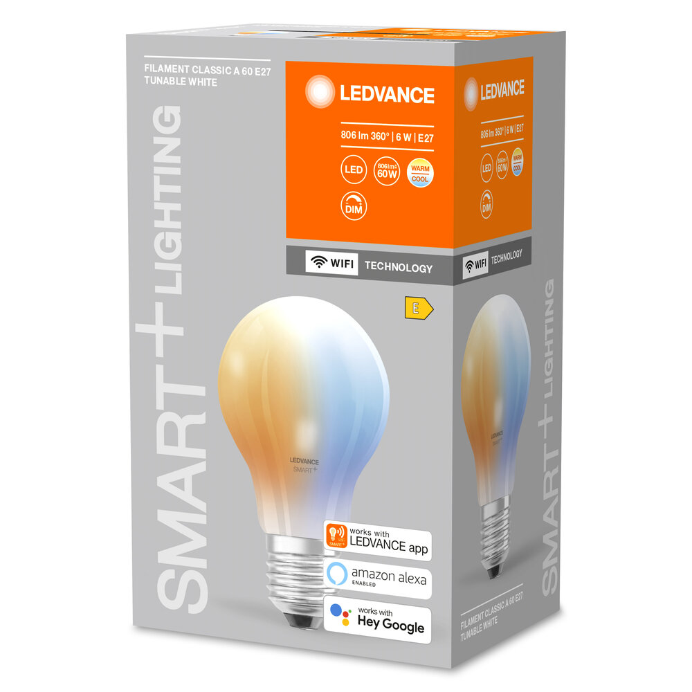 Forma clásica de pistón con tecnología WiFi. Características del producto: Controlable mediante la aplicación WiFi LEDVANCE SMART+ (desde Android™️ 4.4 o iOS 10.0). Control posible mediante Google Assistant o Amazon Alexa. Protocolo de red: WiFi. Color de luz ajustable mediante Blanco ajustable: Blanco cálido a blanco frío (2.700... 6.500 K). Regulable. Vida útil: hasta 15.000 h. Ventajas del producto: Control inalámbrico mediante app. Instalación y uso sencillos. No contiene mercurio. Áreas de aplicación: Iluminación general. Viviente. Comercial (hoteles, bares, boutiques, etc.). Uso exterior solo en luminarias adecuadas para exteriores.