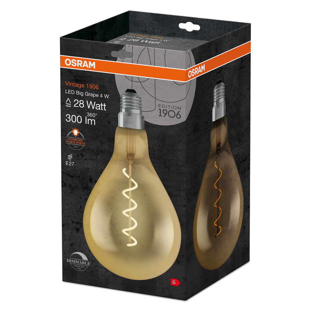Lampes LED dimmables, édition vintage. Caractéristiques du produit : Lampes LED pour la tension secteur. Lampe en verre. Durée de vie : jusqu’à 15 000 h. Angle de largeur : jusqu’à 360°. Dimmable. Bonne qualité de lumière ; Indice de rendu des couleurs Ra : ≥ 80 ; Position constante des couleurs. Avantages du produit : très faible consommation d’énergie. Lumière instantanée à 100 %, pas de temps d’échauffement. Remplacement facile des ampoules standards. Lampes dotées d’une technologie innovante LED « filament ». Zones d’application : Idéales pour les accessoires décoratifs. Applications domestiques. Éclairage général. Utilisation extérieure uniquement dans des luminaires adaptés.