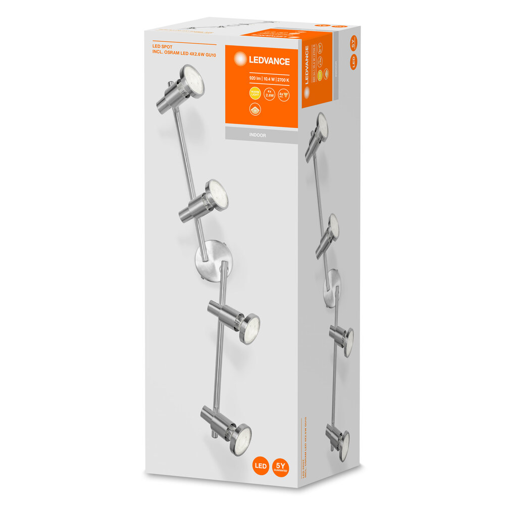 Luminaire de plafond monté en surface avec projecteurs GU10 flexibles. Caractéristiques du produit : La famille des luminaires comprend cinq variantes avec jusqu’à 6 têtes de luminaires en point de projection. Surface de boîtier en nickel brossé. Tête réglable. Avantages du produit : économies d’énergie allant jusqu’à 90 % par rapport aux projecteurs de lampe halogène. Design intemporel. Adaptabilité polyvalente grâce à des lampes LED interchangeables. Installation facile. Domaines d’application : Applications intérieures. Couloirs, entrées, cages d’escalier, salons, sous-sols. Cuisines, espaces de travail. Extension de plafond et de mur. Équipement technique : Équipé d’une lampe LED OSRAM EAN 4058075233263. Accessoires complets de montage et de connexion inclus.