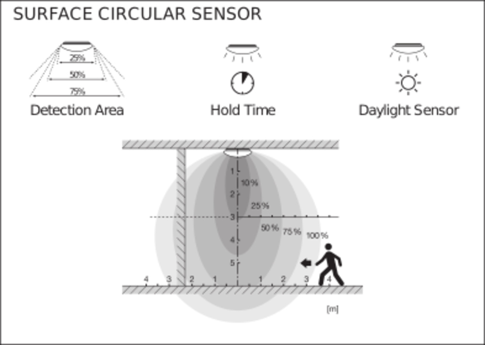 Éclairage mural et de plafond avec IP44 et capteur haute fréquence. Caractéristiques du produit : capteur haute fréquence pour la détection de lumière du jour et de mouvement. Degré de protection : IP44 (montage au plafond), IP 20 (fixation murale). Résistance aux impacts : IK03. Boîtier métallique, housse en PMMA. Plage de température ambiante pendant le fonctionnement : -20...+40 °C. Usage uniquement en intérieur, pas adapté à un usage extérieur. Avantages du produit : réglage facile de la plage des capteurs, détection de lumière du jour et temps de combustion. Luminaire intérieur à haute efficacité lumineuse. Jusqu’à 55 % d’économies d’énergie par rapport aux luminaires utilisant des lampes fluorescentes compactes. Installation simple et rapide. Lumière très homogène. Garantie de 3 ans. Domaines d’application : couloirs. Escaliers. Salle de Bains. Gains. Équipement technique : Couverture de remplacement disponible en option.