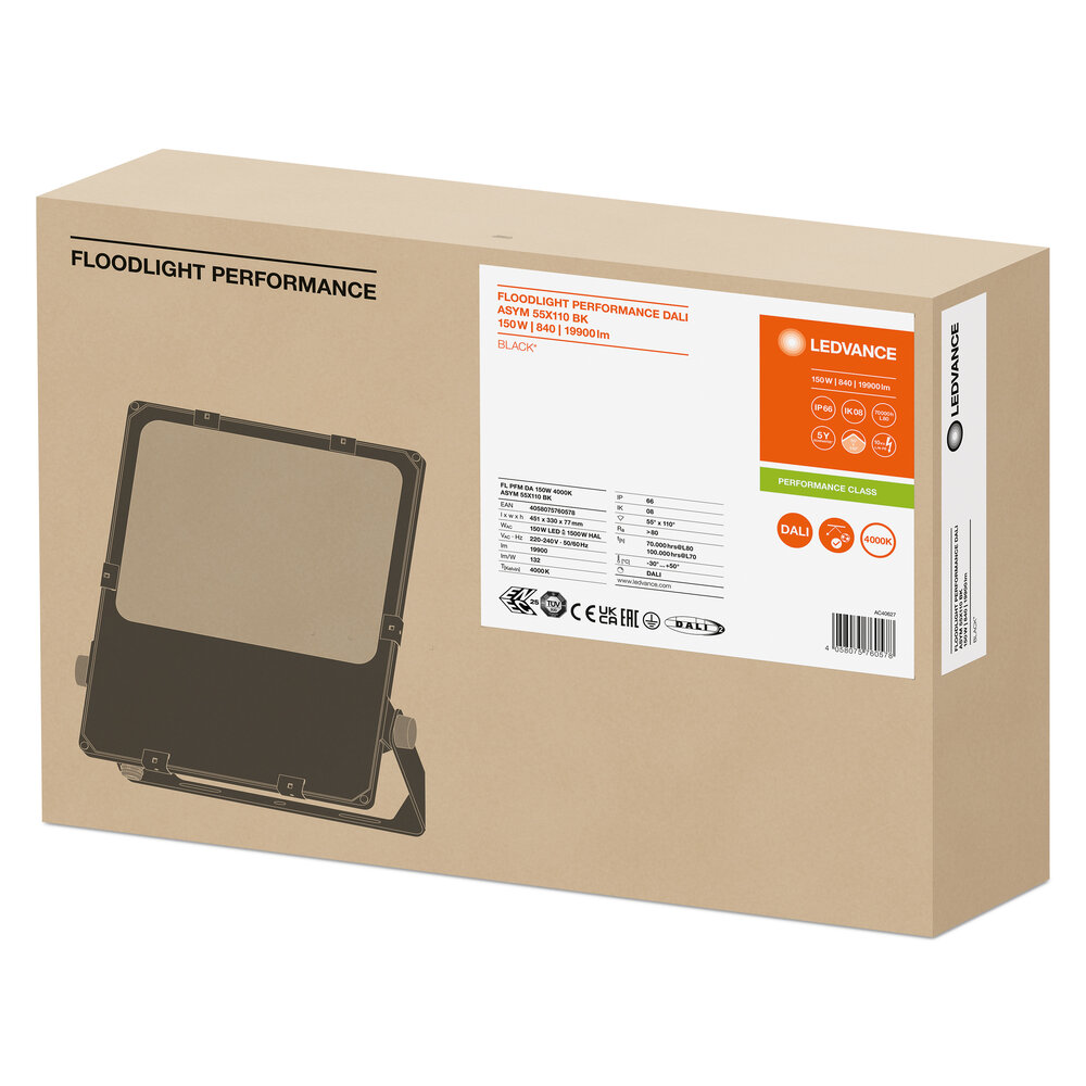 Projecteur basé sur DALI 2.0 avec une large distribution de lumière asymétrique pour une large gamme d’applications. Caractéristiques du produit : Interface DALI 2.0 pour l’intégration dans les systèmes de gestion de l’éclairage. Haute efficacité lumineuse : jusqu’à 140 lm/W. Distribution asymétrique de la lumière pour un large éventail d’applications. Support de montage biseauté (45°) avec une plage de rotation allant jusqu’à 180°. Une protection contre les surtensions allant jusqu’à 10 kV (L/N-PE), 6 KV (L-N). Membrane climatique intégrée pour empêcher la formation de condensation à l’intérieur du luminaire. Connexion par câble (2 m), câblage requis. Degré de protection : IP66. Résistance aux impacts : IK08. Plage de température ambiante pendant le fonctionnement : -30...+50 °C. Avantages produits : économies d’énergie allant jusqu’à 90 % par rapport aux lampes halogènes. Jusqu’à 45 % d’économies d’énergie par rapport aux luminaires utilisant des lampes à décharge conventionnelles. Lumineux, robustes et durables. Distribution uniforme de luminance et réduction de l’éblouissement. Aucune émission de lumière dans le demi-espace supérieur (ULOR 0 %) à une inclinaison de 0°. Keyhole pour une installation encore plus facile. Garantie de 5 ans. Applications : Remplacement direct des luminaires utilisant des lampes HID. Utilisation extérieure (IP66). Parking de parking. Espace public. Industrie. Installations sportives. Éclairage architectural. D-mark selon la norme EN 60598-2-24 pour les locaux commerciaux à risque d’incendie, par exemple en raison de l’accumulation de poussière.