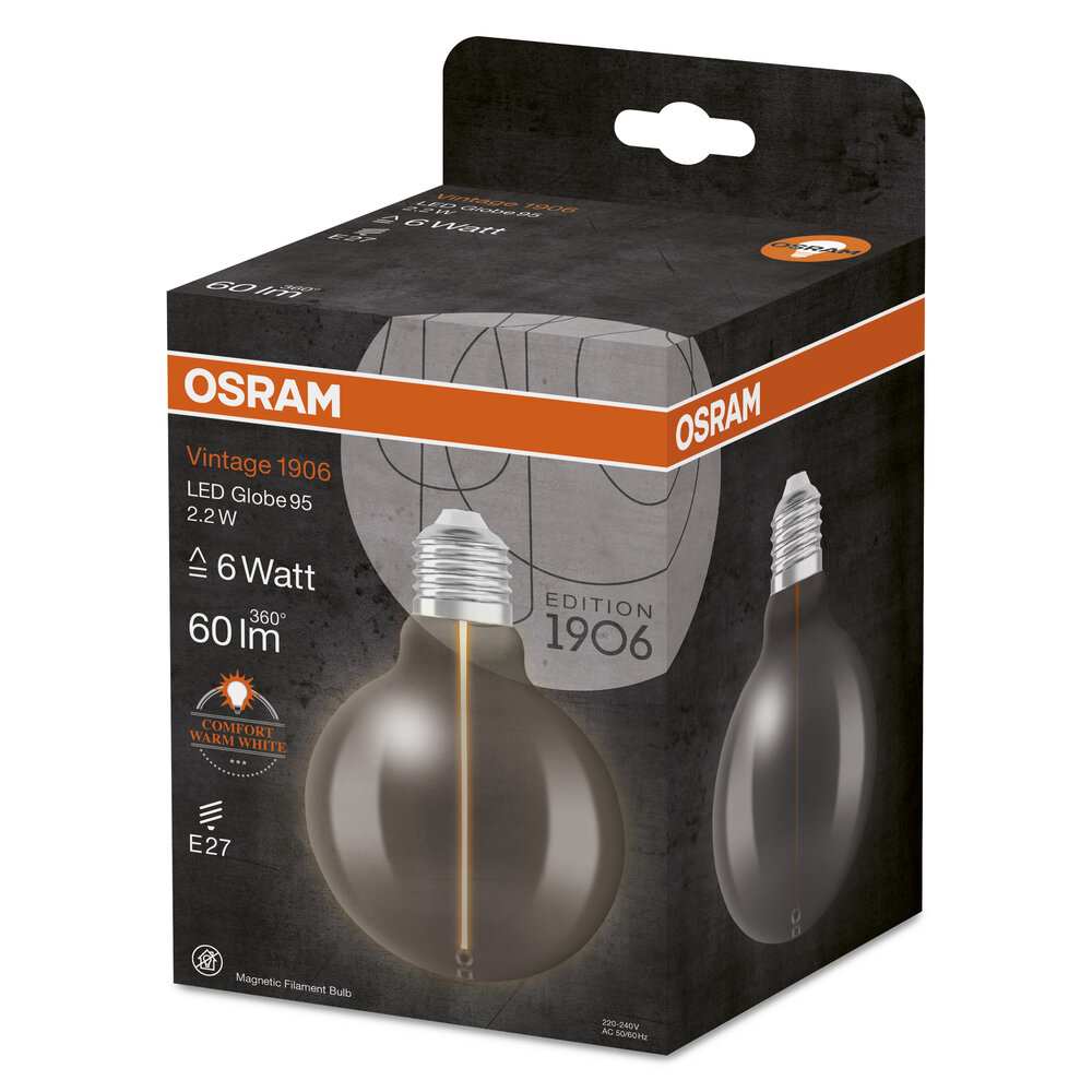 Lampes LED, édition vintage. Caractéristiques du produit : Lampes LED pour la tension secteur. Lampe en verre. Durée de vie : jusqu’à 15 000 h. Angle de largeur : jusqu’à 360°. Bonne qualité de lumière ; Indice de rendu des couleurs Ra : ≥ 80 ; Position constante des couleurs. Avantages du produit : très faible consommation d’énergie. Lumière instantanée à 100 %, pas de temps d’échauffement. Remplacement facile des ampoules standards. Lampes dotées d’une technologie innovante LED « filament ». Zones d’application : Idéales pour les accessoires décoratifs. Applications domestiques. Éclairage général. Utilisation extérieure uniquement dans des luminaires adaptés.