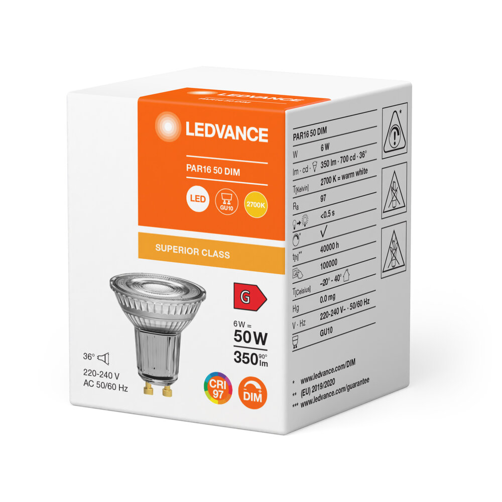 Lampes réflecteurs LED. Caractéristiques du produit : Alternative LED aux lampes halogènes haute tension. Haute consistance des couleurs : ≤ 3 CMD. Dimmable. Base : GU10. Lampe en verre. Excellent rendu des couleurs (Ra : 97). Durée de vie : jusqu’à 40 000 h. Avantages du produit : remplacement simple, rapide et sûr de la lampe sans recâblage. Conception, dimensions, flux lumineux comparable à une lampe incandescente ou halogène. Peu d’entretien à cause de la longue durée de vie. Aucun composant UV et IR dans le faisceau lumineux. Atténuation sans étapes. Compatibilité très élevée des variateurs, voir auchwww.ledvance.de/dim. Lumière instantanée à 100 %, pas de temps de réchauffement. Domaines d’application : Ventes et showrooms. Applications domestiques. Application dans l’industrie. Accent. Utilisation extérieure uniquement dans des luminaires adaptés.