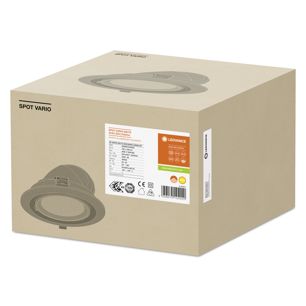 Riflettore incassato girevole. Caratteristiche del prodotto: Grande riflettore sfaccettato per un'elevata efficienza luminosa. Angolo del fascio: 24°. Angolo di rotazione: 0°... 350°, Angolo di inclinazione: 0°... 35°. Diametro del taglio richiesto del soffitto: 165 ... 170 mm. Vantaggi del prodotto: luce a basso sfarfallio grazie a un ballast elettronico speciale. Alta efficienza luminosa. Involucro in alluminio pressofuso per una migliore dissipazione del calore. Facile sostituzione del driver esterno grazie al connettore a baionetta. Il design corrisponde alla famiglia di luminari LEDVANCE Spot, Down e Tracklight. Bassa profondità di installazione. Una vasta gamma di possibilità per accentuare le aree target. Garanzia di 5 anni. Aree di applicazione: Illuminazione di accento e generale per tutti i tipi di sale vendite. Commercio al dettaglio. Supermercati. Negozi, boutique. Camera. Scale. Corridoi. Lobby. Equipaggiamento tecnico: Incluso il pilota.