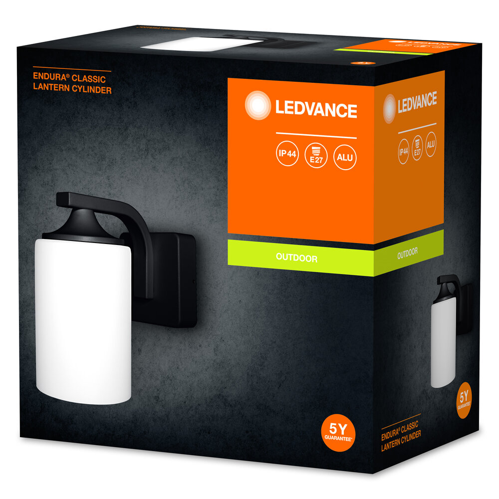 Lampade da parete, cilindriche con diffusore di vetro. Caratteristiche del prodotto: Diffusore in vetro smerigliato. Involucro in alluminio pressofuso. Grado di protezione: IP43. Vantaggi del prodotto: Alta flessibilità nella scelta della lampadina grazie alla presa E27. Adatto per applicazioni smart grazie alla compatibilità con le lampade Smart+ di LEDVANCE. Installazione semplice e rapida. Aree di applicazione: Illuminazione d'ingresso. Terrazze, balconi. Equipaggiamento tecnico: accessori di montaggio e connessione completi inclusi. Nessuna lampadina inclusa.
