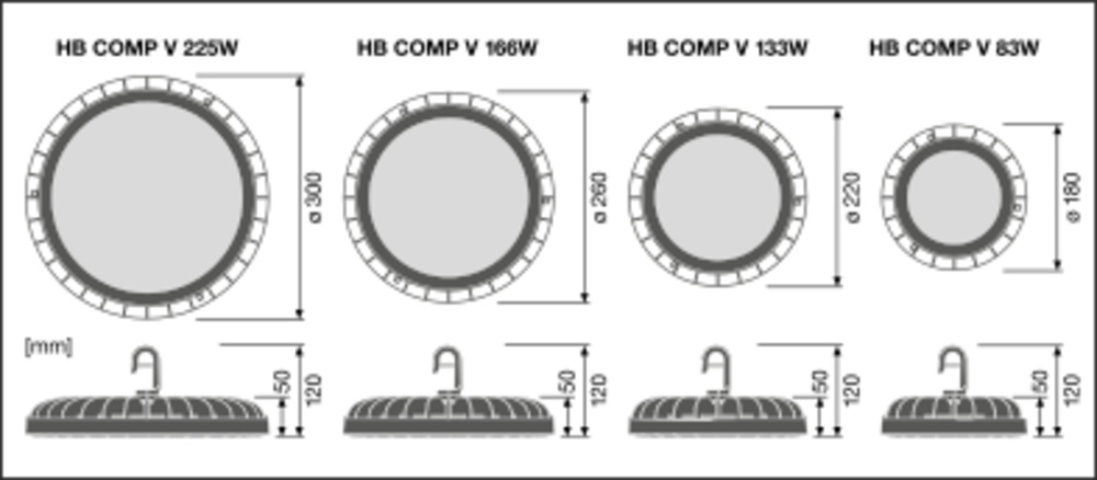 Luci ad alta baia fino a 120 lm/W. Caratteristiche del prodotto: Temperatura ambiente: -20... 45°C. Involucro in alluminio nero, coperchio in vetro di sicurezza. Copertura in opale. Grado di protezione: IP65. Durata utile (L70): fino a 50.000 h. Alta efficienza luminosa: fino a 120 lm/W. Vantaggi del prodotto: design moderno ed esclusivo. Fino al 60% di risparmio energetico rispetto ai lampadari a specchio convenzionali ad alta baia. Garanzia di 3 anni. Ottimizzazione di peso e dimensioni tramite progettazione compatta. Aree di applicazione: sostituzione delle lampade a specchio ad alta baia con lampade a vapore di mercurio o alogenuri metallici. Magazzini. Sale logistiche. Industria. Soffitti alti (ad esempio nei centri commerciali, aeroporti, edifici commerciali, atrii). Equipaggiamento tecnico: supporto disponibile. riflettore disponibile.