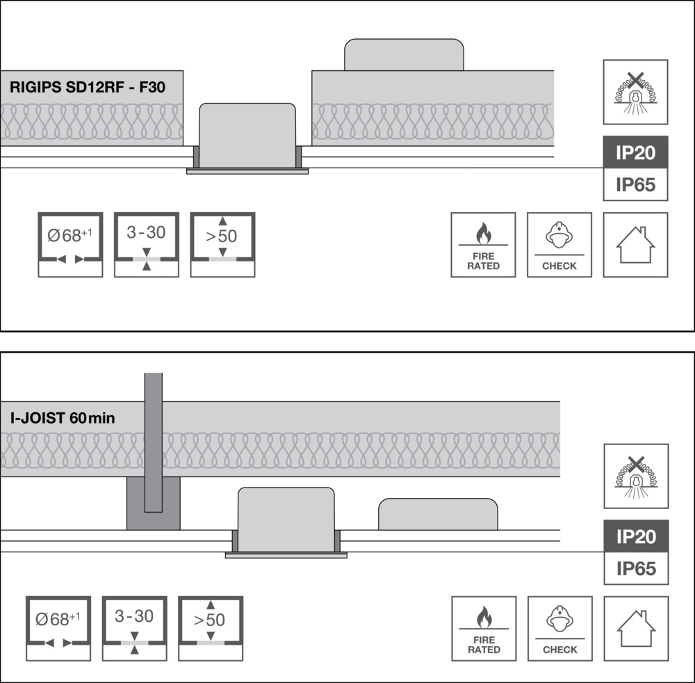 Riflettori incassati per alcuni falsi soffitti ignifughi, fissi