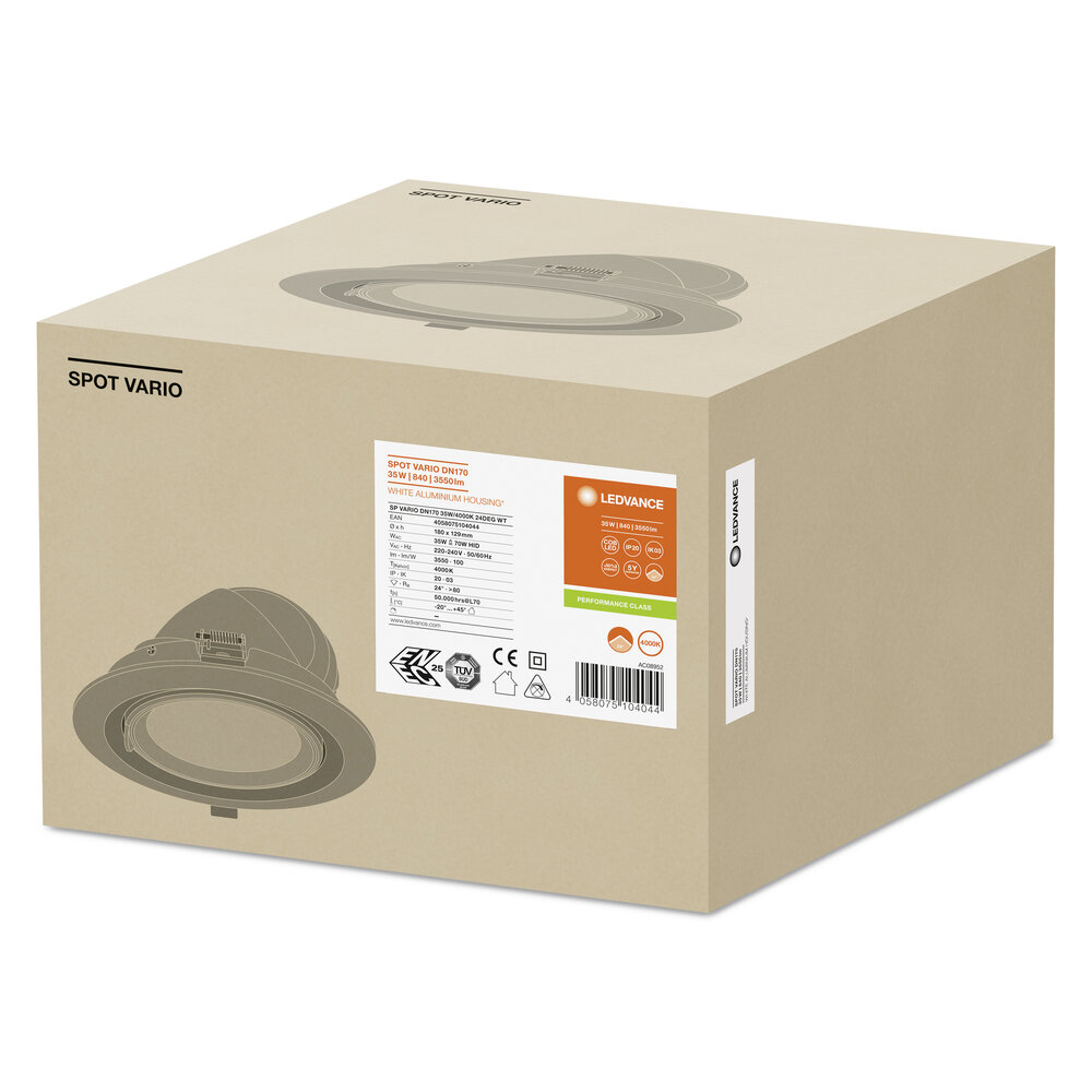 Schwenkbarer Einbaustrahler. Produkteigenschaften: Großer facettierter Reflektor für hohe Lichtausbeute. Ausstrahlungswinkel: 24°. Drehwinkel: 0°...350°, Neigungswinkel: 0°...35°. Durchmesser des erforderlichen Deckenausschnitt: 165 ... 170 mm. Produktvorteile: Flimmerarmes Licht dank speziellem elektronischen Vorschaltgerät. Hohe Lichtausbeute. Gehäuse aus Druckgussaluminium für verbesserte Wärmeableitung. Einfacher Austausch des externen Treibers dank Stecker mit Bajonettverschluss. Design passt zur LEDVANCE Spot-, Down- und Tracklight-Leuchtenfamilie. Geringe Einbautiefe. Vielfältige Möglichkeiten, die Zielbereiche zu akzentuieren. 5 Jahre Garantie. Anwendungsgebiete: Akzent- und Allgemeinbeleuchtung für alle Arten von Verkaufsräumen. Einzelhandel. Supermärkte. Shops, Boutiquen. Hotelzimmer. Treppenhäuser. Flure. Lobbys. Technische Ausstattung: Treiber inbegriffen.