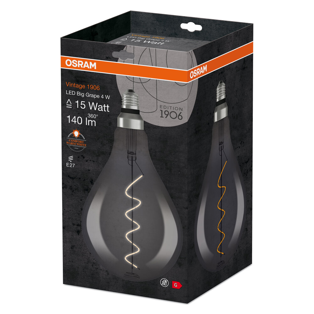 LED-Lampen, Vintage-Edition. Produkteigenschaften: LED-Lampen für Netzspannung. Lampe aus Glas. Lebensdauer: bis zu 15.000 h. Ausstrahlungswinkel: bis zu 360°. Gute Lichtqualität; Farbwiedergabeindex Ra: ≥ 80; konstanter Farbort. Produktvorteile: Sehr geringer Energieverbrauch. Sofort 100 % Licht, keine Aufwärmzeit. Einfacher Austausch von Standardglühlampen. Lampen mit innovativer LED-"Filament"-Technologie. Anwendungsgebiete: Ideal für dekorative Einbauten. Anwendungen im Haushalt. Allgemeinbeleuchtung. Einsatz im Außenbereich nur in geeigneten Außenleuchten.