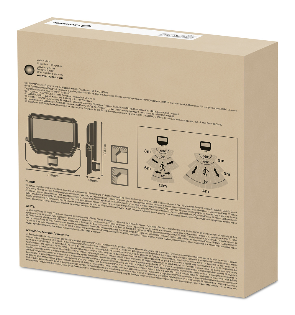 Fluter mit flexiblem Bewegungs- und Tageslichtsensor, bis zu 6000 lm Lichtstrom. Produkteigenschaften: Flexibler Bewegungs- und Tageslichtsensor. Sensor 350° schwenkbar und 180° neigbar. Reflektorbasierte, symmetrische Lichtverteilung mit 100° x 100° Abstrahlwinkel. Integriertes Vorschaltgerät mit großem Eingangsspannungsbereich, geeignet für 100 - 277 V AC. Überspannungsschutz: bis zu 4 kV (L/N-PE), 2 kV (L-N). Montagebügel mit 30° Winkel und großem Rotationsbereich. Klimamembran für optimierten Luftaustausch, bei konstant hohem IP-Schutzgrad. Vorinstalliertes, flexibles Kabel (H05RN-F) mit 1 m Länge, 3 x 1.0 mm² gekrimpt. Produktvorteile: Lichtstark, robust und langlebig. Bedarfsoptimierte Beleuchtung dank flexiblem, programmierbarem Sensor. Einfache Einstellung der Sensorreichweite, Tageslichtserkennung und Leuchtdauer. Dauerbetrieb möglich, Aktivierung mittels speziellem Einschaltschema. Sichere und sehr gleichmäßige Ausleuchtung, dank opalem, gehärtetem Glasdiffusor. Kein Lichtaustritt im oberen Halbraum (ULOR 0%) bei 0° Aufneigung. Energieersparnis von bis zu 90 % verglichen mit Halogenlampen-Flutern. 5 Jahre Garantie. Anwendungsgebiete: Ersatz für Fluter mit Halogenlampen. Außenanwendung (IP65). Öffentlicher Raum. Anstrahlung von Fassaden. Baustellen. Gärten, Balkone und andere Außenbereiche.