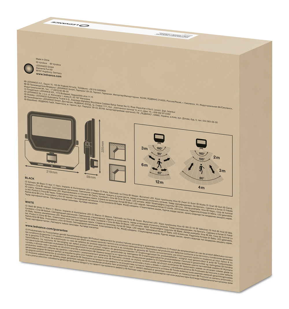Fluter mit flexiblem Bewegungs- und Tageslichtsensor, bis zu 6000 lm Lichtstrom. Produkteigenschaften: Flexibler Bewegungs- und Tageslichtsensor. Sensor 350° schwenkbar und 180° neigbar. Reflektorbasierte, symmetrische Lichtverteilung mit 100° x 100° Abstrahlwinkel. Integriertes Vorschaltgerät mit großem Eingangsspannungsbereich, geeignet für 100 - 277 V AC. Überspannungsschutz: bis zu 4 kV (L/N-PE), 2 kV (L-N). Montagebügel mit 30° Winkel und großem Rotationsbereich. Klimamembran für optimierten Luftaustausch, bei konstant hohem IP-Schutzgrad. Vorinstalliertes, flexibles Kabel (H05RN-F) mit 1 m Länge, 3 x 1.0 mm² gekrimpt. Produktvorteile: Lichtstark, robust und langlebig. Bedarfsoptimierte Beleuchtung dank flexiblem, programmierbarem Sensor. Einfache Einstellung der Sensorreichweite, Tageslichtserkennung und Leuchtdauer. Dauerbetrieb möglich, Aktivierung mittels speziellem Einschaltschema. Sichere und sehr gleichmäßige Ausleuchtung, dank opalem, gehärtetem Glasdiffusor. Kein Lichtaustritt im oberen Halbraum (ULOR 0%) bei 0° Aufneigung. Energieersparnis von bis zu 90 % verglichen mit Halogenlampen-Flutern. 5 Jahre Garantie. Anwendungsgebiete: Ersatz für Fluter mit Halogenlampen. Außenanwendung (IP65). Öffentlicher Raum. Anstrahlung von Fassaden. Baustellen. Gärten, Balkone und andere Außenbereiche.