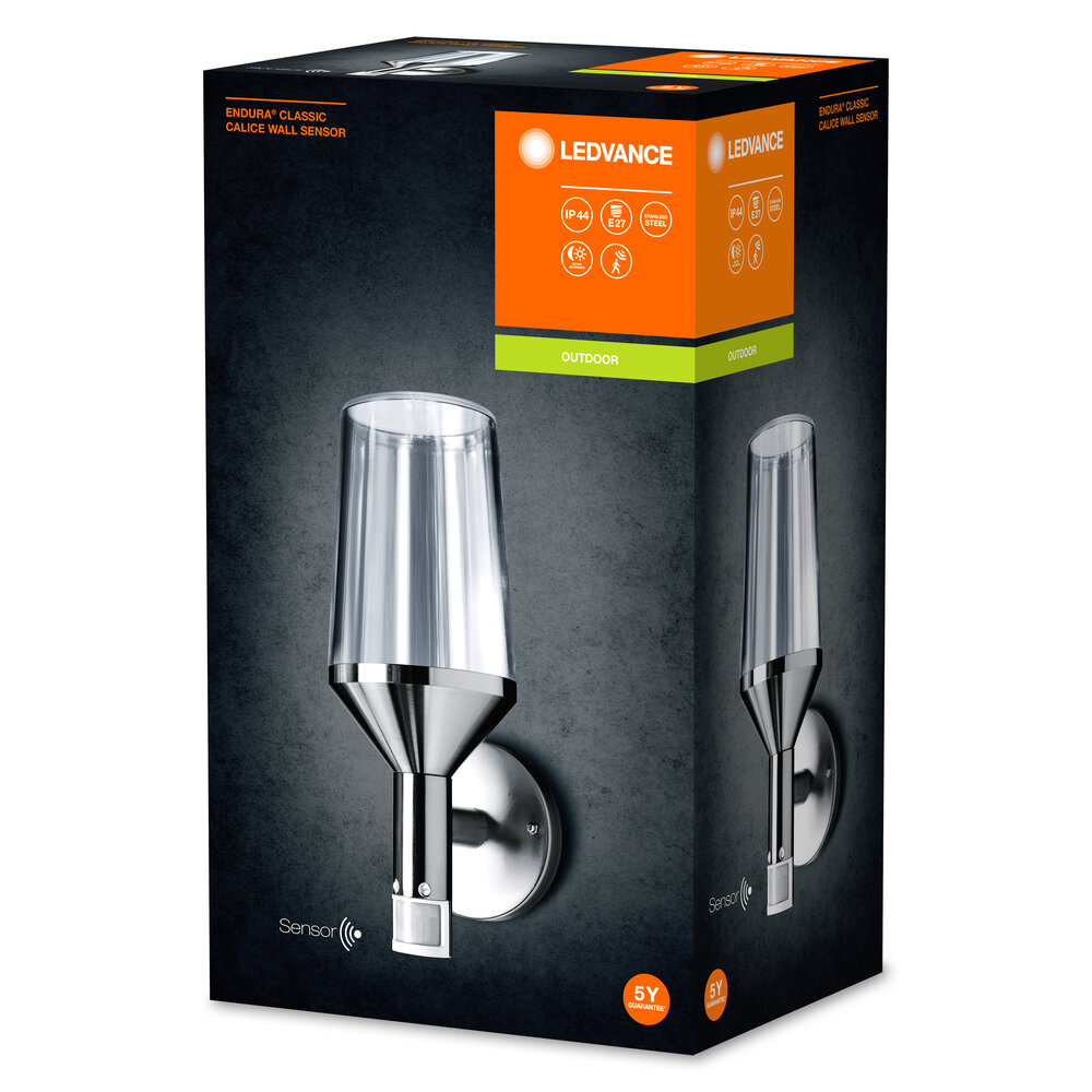 Edelstahlleuchte mit Glasdiffusor. Produkteigenschaften: Verfügbar mit und ohne Bewegungssensor. Gehäuse aus Edelstahl. Schutzart: IP44. Produktvorteile: Hohe Flexibilität bei der Wahl des Leuchtmittels dank E27-Fassung. Einfache und schnelle Installation. Anwendungsgebiete: Anstrahlung von Fassaden. Eingangsbeleuchtung. Terrassen, Balkone. Wegebeleuchtung. Auffahrten. Technische Ausstattung: Vollständiges Montage- und Anschlusszubehör enthalten. Keine Leuchtmittel enthalten.