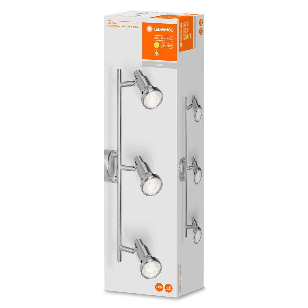 Deckenanbau-Leuchte mit flexiblen GU10-Strahlern. Produkteigenschaften: Leuchtenfamilie umfasst fünf Varianten mit bis zu 6 Spot-Leuchtenköpfen. Gehäuseoberfläche aus gebürstetem Nickel. Einstellbarer Kopf. Produktvorteile: Energieersparnis von bis zu 90 % verglichen mit Halogenlampen-Spotlights. Zeitloses Design. Vielseitig anpassbar dank austauschbaren LED Lampen. Einfache Montage. Anwendungsgebiete: Innenraumanwendungen. Korridore, Eingangsbereiche, Treppenhäuser, Wohnzimmer, Keller. Küchen, Arbeitsbereiche. Decken- und Wandanbau. Technische Ausstattung: Bestückt mit OSRAM LED-Lampe EAN 4058075233263. Vollständiges Montage- und Anschlusszubehör enthalten.