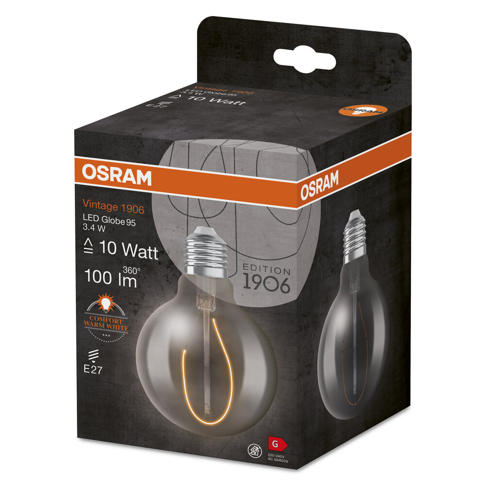 LED-Lampen, Vintage-Edition. Produkteigenschaften: LED-Lampen für Netzspannung. Lampe aus Glas. Lebensdauer: bis zu 15.000 h. Ausstrahlungswinkel: bis zu 360°. Gute Lichtqualität; Farbwiedergabeindex Ra: ≥ 80; konstanter Farbort. Produktvorteile: Sehr geringer Energieverbrauch. Sofort 100 % Licht, keine Aufwärmzeit. Einfacher Austausch von Standardglühlampen. Lampen mit innovativer LED-"Filament"-Technologie. Anwendungsgebiete: Ideal für dekorative Einbauten. Anwendungen im Haushalt. Allgemeinbeleuchtung. Einsatz im Außenbereich nur in geeigneten Außenleuchten.
