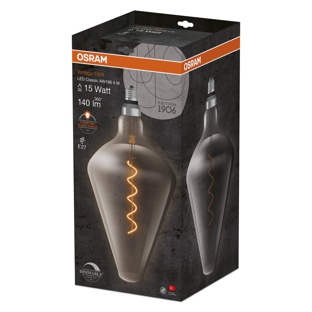 Dimmbare LED-Lampen, Vintage-Edition. Produkteigenschaften: LED-Lampen für Netzspannung. Lampe aus Glas. Lebensdauer: bis zu 15.000 h. Ausstrahlungswinkel: bis zu 360°. Dimmbar. Gute Lichtqualität; Farbwiedergabeindex Ra: ≥ 80; konstanter Farbort. Produktvorteile: Sehr geringer Energieverbrauch. Sofort 100 % Licht, keine Aufwärmzeit. Einfacher Austausch von Standardglühlampen. Lampen mit innovativer LED-"Filament"-Technologie. Anwendungsgebiete: Ideal für dekorative Einbauten. Anwendungen im Haushalt. Allgemeinbeleuchtung. Einsatz im Außenbereich nur in geeigneten Außenleuchten.