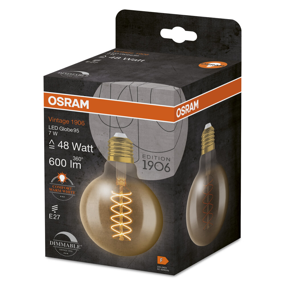 Dimmbare LED-Lampen, Vintage-Edition. Produkteigenschaften: LED-Lampen für Netzspannung. Lampe aus Glas. Lebensdauer: bis zu 15.000 h. Ausstrahlungswinkel: bis zu 360°. Dimmbar. Gute Lichtqualität; Farbwiedergabeindex Ra: ≥ 80; konstanter Farbort. Produktvorteile: Sehr geringer Energieverbrauch. Sofort 100 % Licht, keine Aufwärmzeit. Einfacher Austausch von Standardglühlampen. Lampen mit innovativer LED-"Filament"-Technologie. Anwendungsgebiete: Ideal für dekorative Einbauten. Anwendungen im Haushalt. Allgemeinbeleuchtung. Einsatz im Außenbereich nur in geeigneten Außenleuchten.