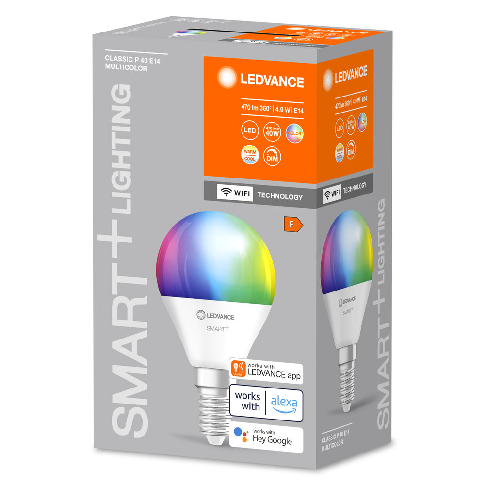 Klassische Miniballform mit WiFi-Technologie. Produkteigenschaften: Steuerbar über LEDVANCE SMART+ WiFi App (ab Android™️ 4.4 oder iOS 10.0). Lichtfarbe über Tunable White einstellbar: Warmweiß bis Kaltweiß (2.700…6.500 K). RGB-Farbsteuerung, ca. 16 Mio. Farbmöglichkeiten einstellbar. Dimmbar. Netzwerkprotokoll: WiFi. Lebensdauer: bis zu 20.000 h. Stimmenkontrolle über Hey Google oder Alexa möglich. Produktvorteile: Drahtlose Steuerung über App. Einfache Installation und Nutzung. Enthält kein Quecksilber. Anwendungsgebiete: Allgemeinbeleuchtung. Wohnräume. Gewerbe (Hotels, Bars, Boutiquen usw.). Einsatz im Außenbereich nur in geeigneten Außenleuchten.