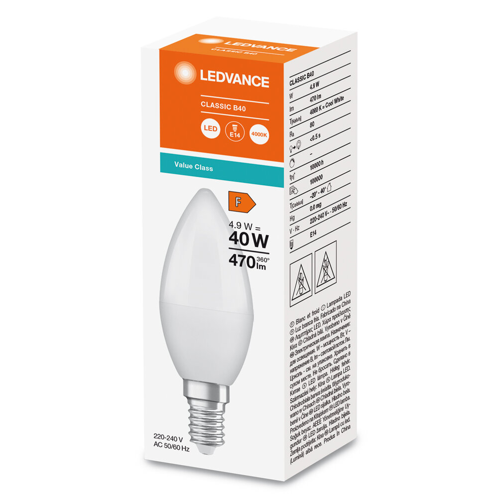 LED-Lampen, klassische Minikerzenform. Produkteigenschaften: Professionelle LED-Lampen für Netzspannung. Nicht dimmbar. Lebensdauer: bis zu 15.000 h. Gute Lichtqualität; Farbwiedergabeindex Ra: ≥ 80; konstanter Farbort. Produktvorteile: Geringer Energieverbrauch. Einfacher Ersatz von klassischen Lampen dank kompaktem Design. Sofort 100 % Licht, keine Aufwärmzeit. Anwendungsgebiete: Anwendungen im Haushalt. Allgemeinbeleuchtung. Kronleuchter. Einsatz im Außenbereich nur in Außenleuchten (mindestens IP65).